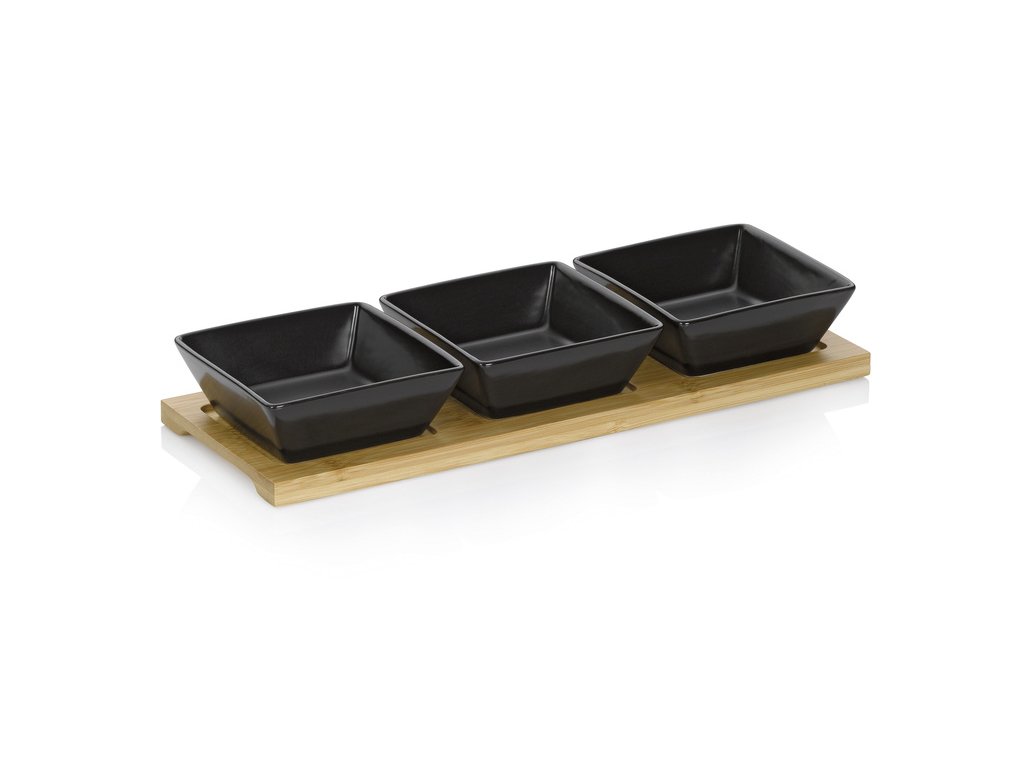 Servírujte stylově: Se sadou misek Philipa z porcelánu v černé barvě si dipy a finger food přijdou na své. Sada se skládá ze základní desky z hnědého bambusu. Na to jsou umístěny 3 bílé misky na namáčení. Talíř je 33,5 cm dlouhý, 12 cm široký a 5 cm vysoký. Sada misek je k dispozici také ve stejném designu se zaoblenými miskami a v barvě bílé 3 misky porcelánové, matná černá, na bambusovém talíři misky: 11 x 11 cm 4 cm v celkem: 33,5 cm x 12 cm x 5 cm hDoplňkové parametry