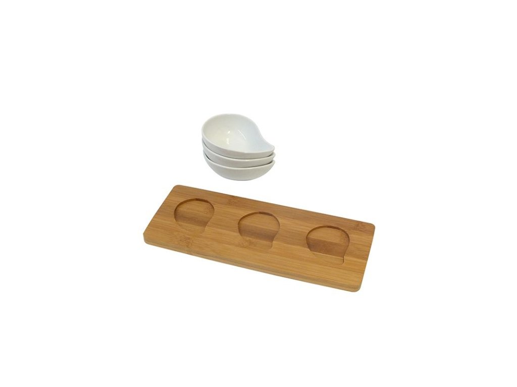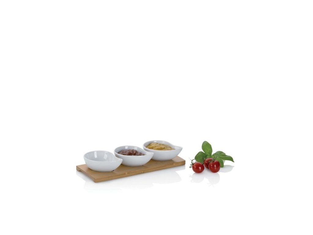 - bambusový tác- 3x porcelánová miska- rozměry: 26 x 10 cm- výška misek: 4 cm- ideální k servírování omáček, předkrmů, dipů, pochutin,..Doplňkové parametry