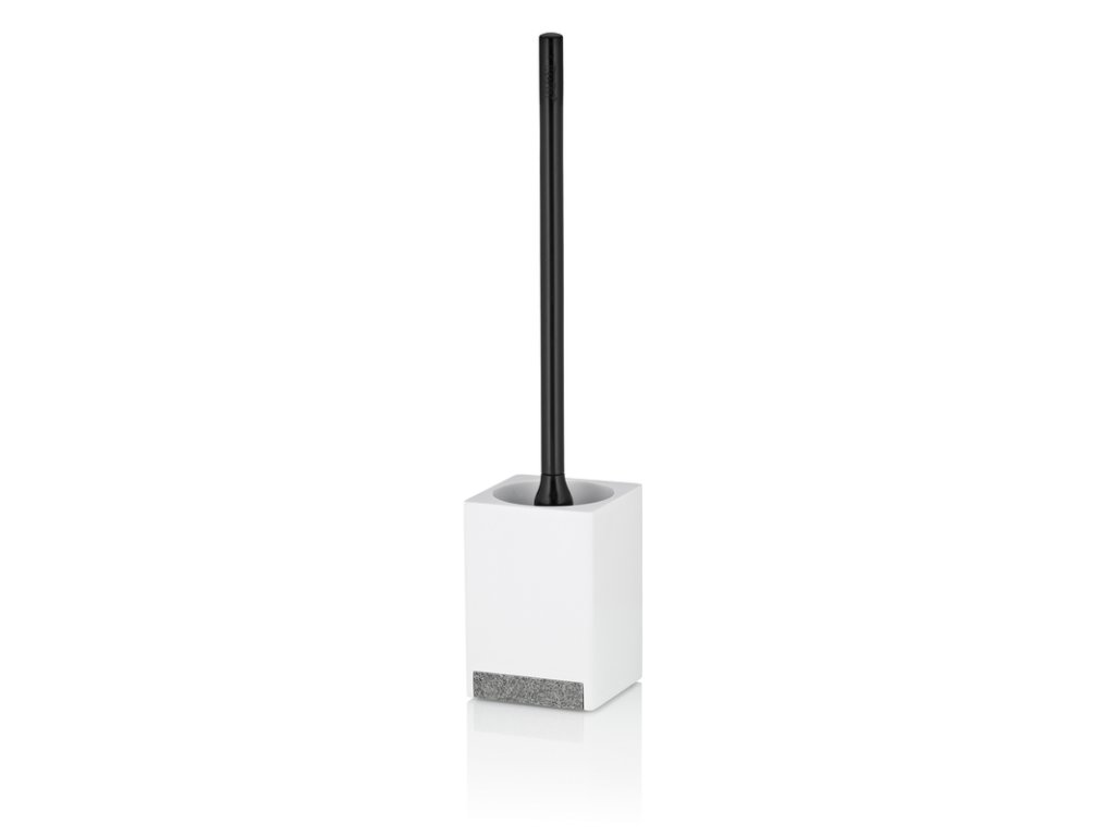 Stylové koupelnové doplňky v bílé barvě: WC sada Cube white je vyrobena z snadno udržovatelného bílého plastu. Nápadná je kombinace s obyčejnou bílou a plastovým prvkem s kamenným vzhledem. Rukojeť toaletní štětky je černá a vyrobena z ABS plastu. Hlava WC kartáče je vyměnitelná, stejně jako samotná rukojeť.Waletová sada má čtvercovou základnu 9,5 x 9,5 cm a je vysoká 45,5 cm. Polyresin, matná bílá 9,5x9,5cm, 45,5cm vDoplňkové parametry