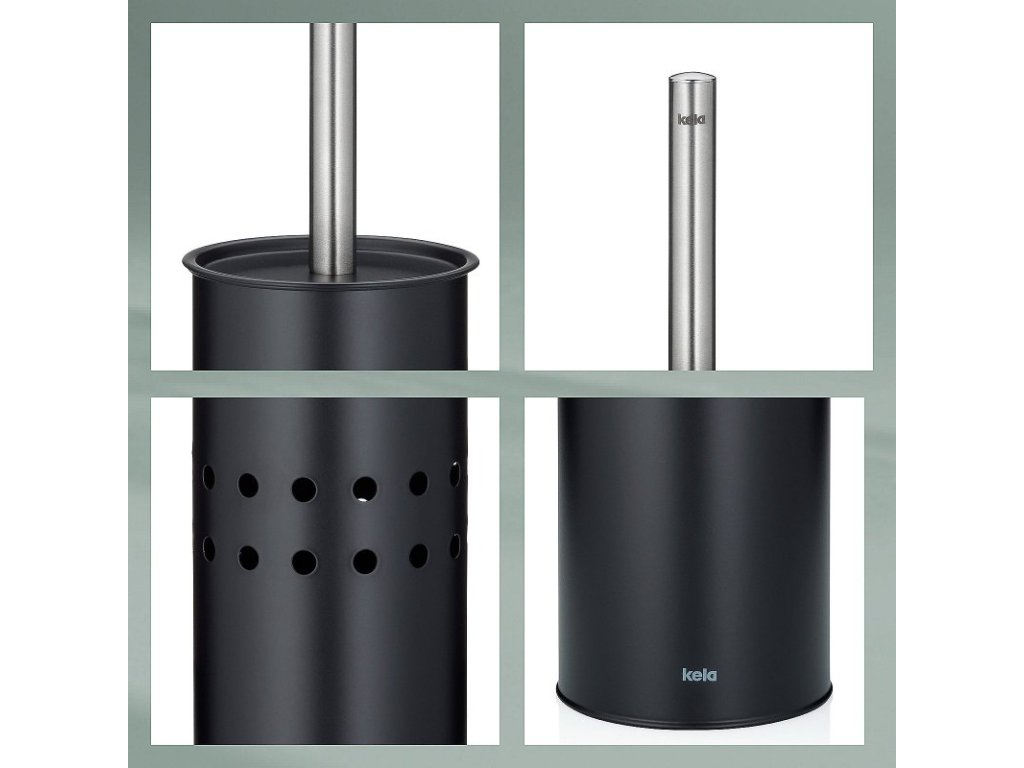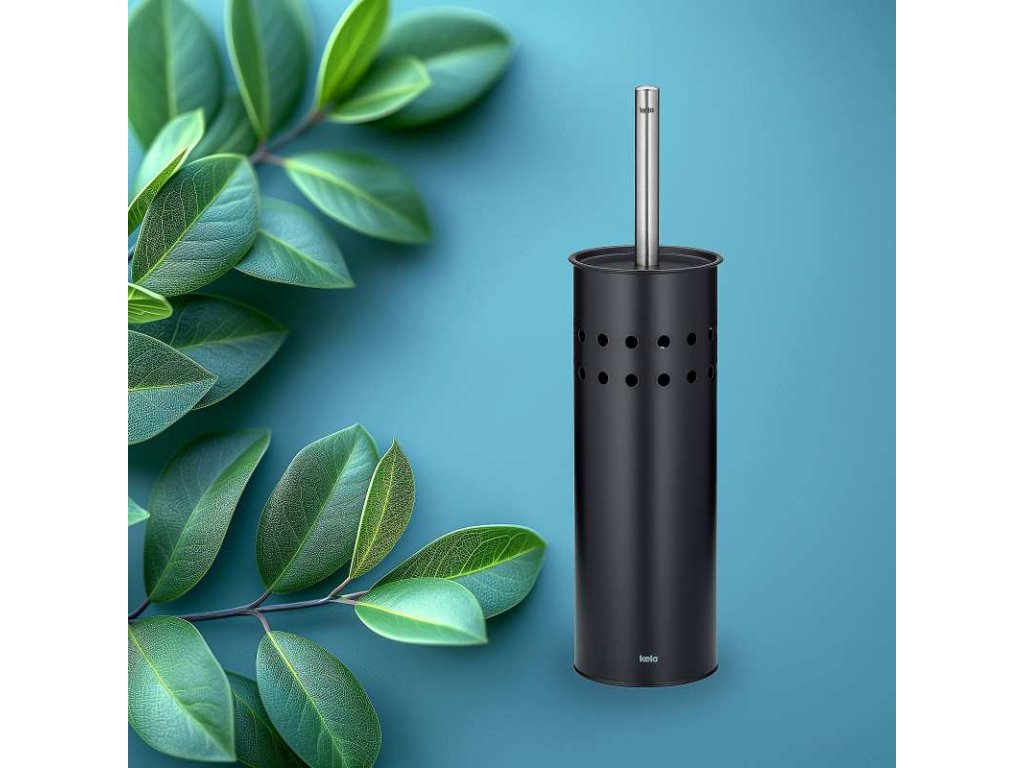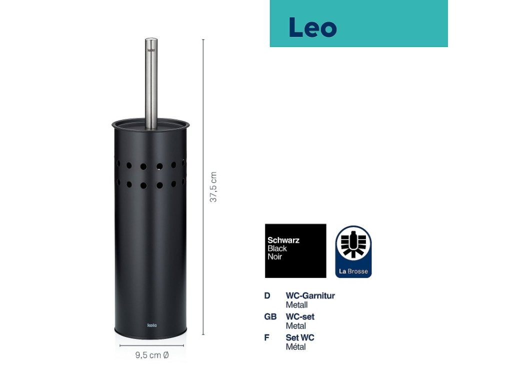 Uzavřená toaletní souprava Leo je vyrobena z kovu s práškovým nástřikem a zdobená perforovaným vzorem po celém obvodu. Rukojeť toaletní štětky je z nerezové oceli a lze ji v případě potřeby vyměnit stejně jako hlavici štětky. Vnitřní plastová nádoba zachycuje odkapávající vodu a lze ji snadno vyjmout pro vyprázdnění a čištění.