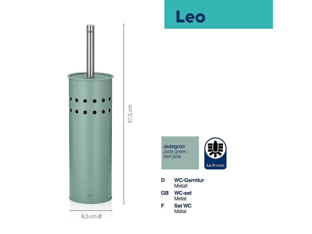 Uzavřená toaletní souprava Leo je vyrobena z kovu s práškovým nástřikem a zdobená perforovaným vzorem po celém obvodu. Rukojeť toaletní štětky je z nerezové oceli a lze ji v případě potřeby vyměnit stejně jako hlavici štětky. Vnitřní plastová nádoba zachycuje odkapávající vodu a lze ji snadno vyjmout pro vyprázdnění a čištění.