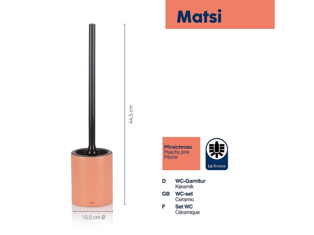 Keramická sada Matsi dodá vaší koupelně jemný akcent v broskvově růžové barvě. Sada je vybavena kartáčem La Brosse v elegantní černé barvě, včetně plastové rukojeti. Tento praktický a stylový doplněk zaručuje dokonalou čistotu vaší toalety.