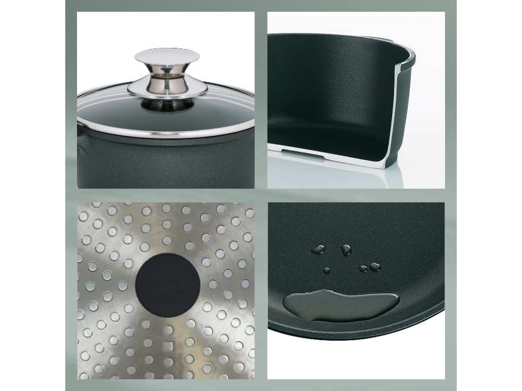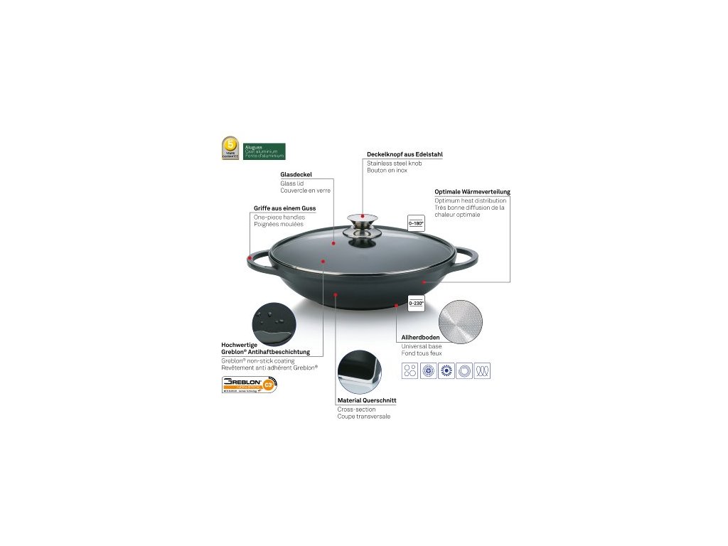 - materiál: tlakově litý hliník- vnitřní keramický povrch GREBLON C3+- průměr: 32 cm- výška: 8,5 cm- tloušťka stěny: 5 mm- objem: 4 l- skleněné poklice- vhodná pro všechny typy ohřevů včetně indukce- série: Kerros- značka: KELA- záruka 5 letKerros série je vyrobena ze silného litého hliníku s tloušťkou stěny 5 mm. Zvláštní znak kvality: 6 hvězdičkový nepřilnavý povrch GREBLON-C3+. 3-vrstvá, keramikou plněná teflonová vrstva se vyznačuje vynikající anti-adhezním efektem, vysokou odolností proti poškrábání a velmi dobrou odolností proti oděru.Doplňkové parametry