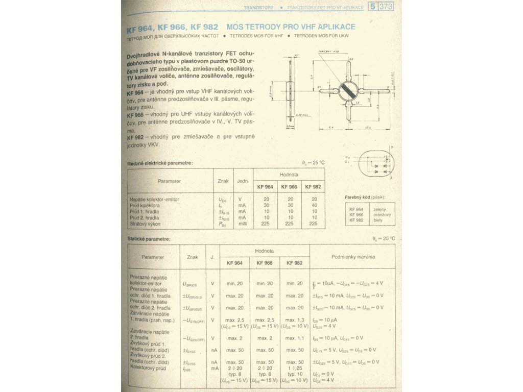 KF982 N MOSFET 20V/0,04A 0,3W 200MHz TO50 /BF982/ bílý proužek, k použití pro VHF směšovače a vstupní jednotkyDoplňkové parametry