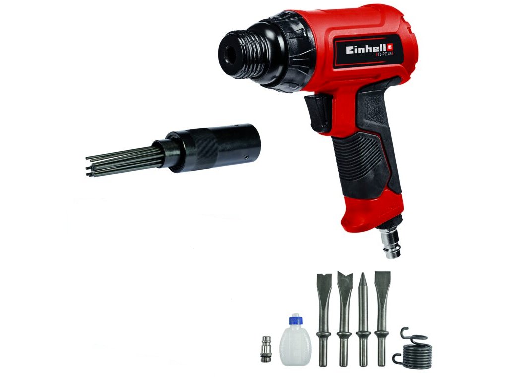 Pneumatické sekací kladivo Einhell TC-PC 45 je výkonným pomocníkem při zdolávání kamenných nebo kovových materiálů, při demoličních a renovačních pracích v domácnosti i mimo ni. Pro bezpečnost práce má integrovanou protiskluzovou pogumovanou rukojeť s uživatelsky přívětivým designem. S maximálním provozním tlakem 6,3 bar poskytuje nástroj rychlost úderu až 4500 ^ min-1, a sílu úderu až 1,2 joulu. Šestihranný nástavec zaručuje bezpečné vedení sekáče. Rozsah dodávky zahrnuje nejen čtyřdílnou sadu sekáčů o délce 120 mm, ale také odpovídající nástavec pro jehlový scaler, který pomáhá odstraňovat rzi a čistit povrchy. Součástí sady je také 1 malá láhev s olejem, 1 vsuvka a 1 napínací pružina. Technická data: - max. provozní tlak: 6,3 bar - spotřeba vzduchu: 113 l / min - rychlost foukání: 4500 min ^ -1 - zdvih: 43 mm - rázový výkon: 1,2 J Logistické údaje: - délka: 350 mm - šířka: 260 mm - výška: 90 mm - hmotnost balení: 3,5 kg - hmotnost produktu: 1 kg Dodáváno bez kufruDoplňkové parametry
