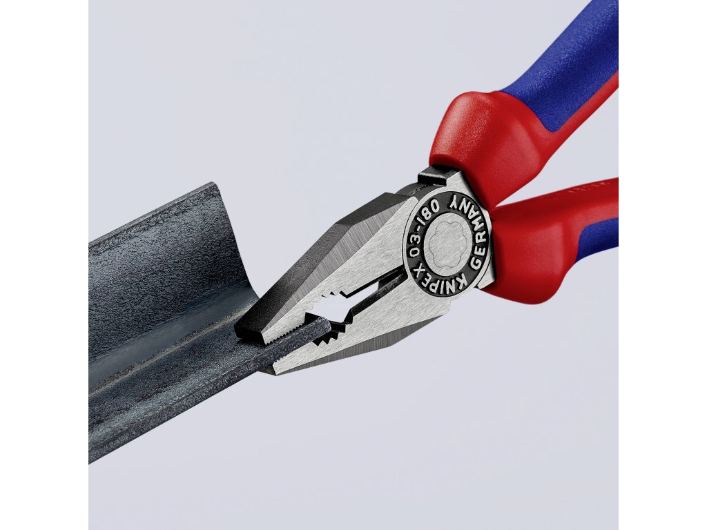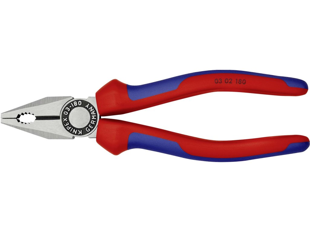 Kombinované kleště („kombinačky“), přecvakávání vodičů až 16 mm^2, délka 18 cm, PVC rukojeti – KNIPEX 03 02 180