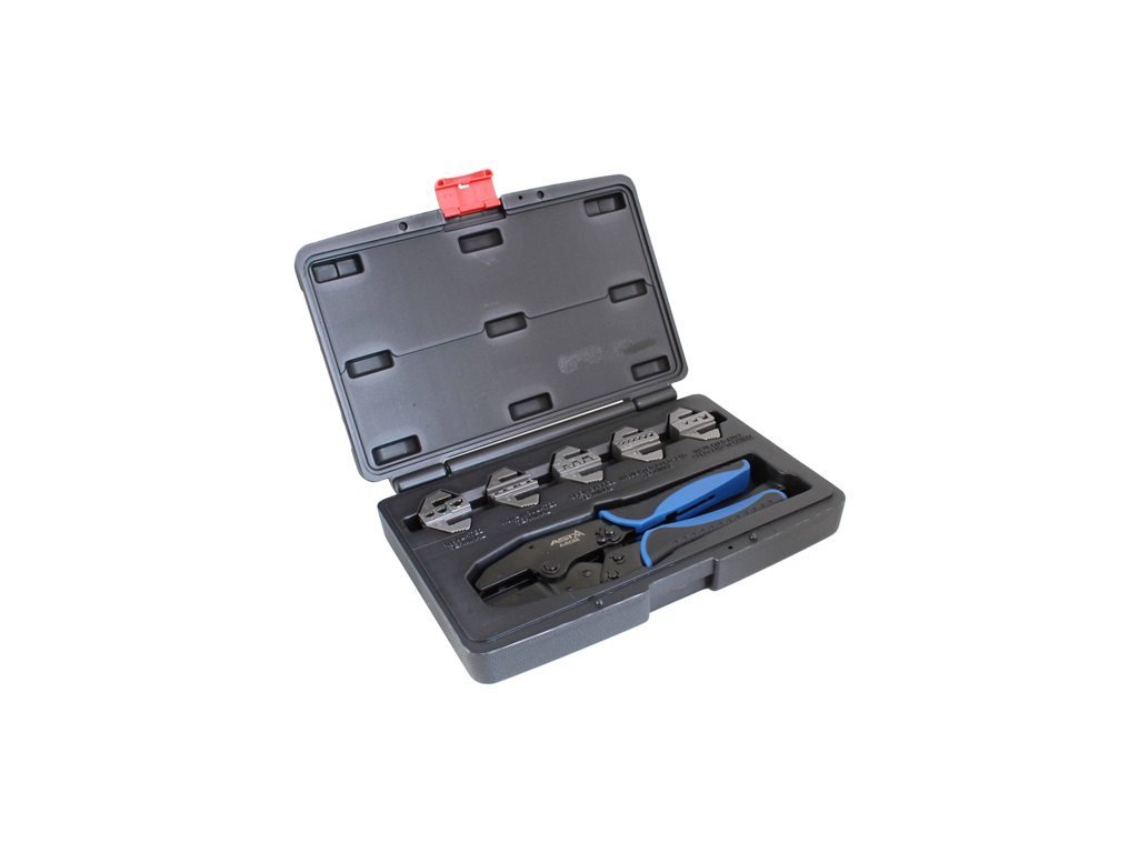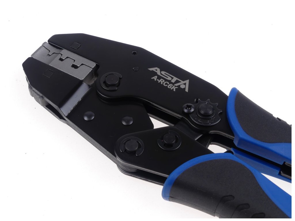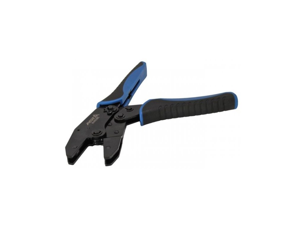 Kleště elektrikářské, krimpovací – lisovací tzv. „krimpovačky“ na elektrické konektory 0,5 - 16 mm2, 5 výměnných matric, pro neizolované i izolované kabelové svorky a konektory (koncovky) různých druhů, s aretací (ráčnovým systémem) – ASTA A-RC6K.
