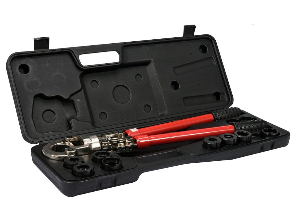 Lisovací kleště na plastové vodovodní potrubí PEX-AL-PEX, PERT-AL-PERT se sadou 8 výměnných čelistí U a TH.
