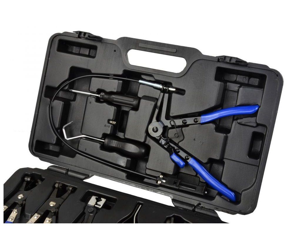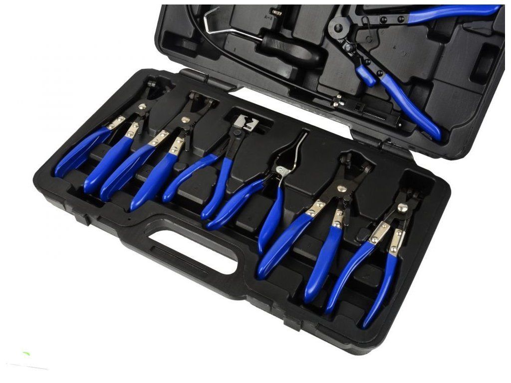 - Komplexní sada 9 nástrojů – univerzální i speciální typy kleští, přípravek na stahování hadic, oboustranný šroubovák