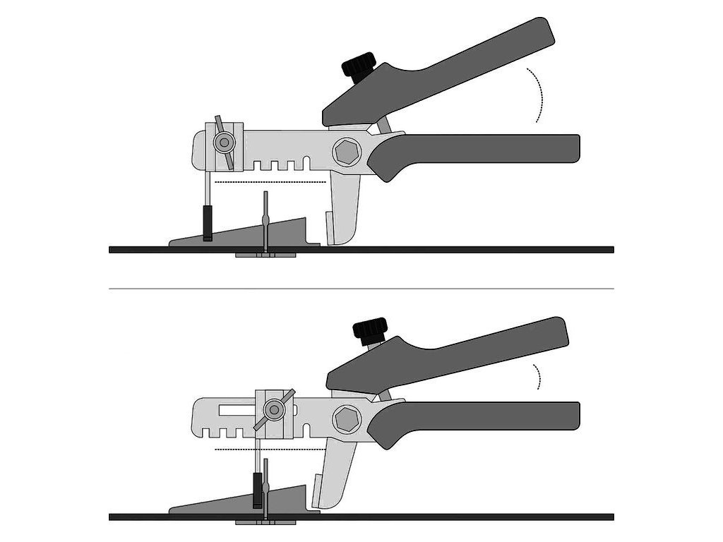 Kleště určené pro efektivní, rychlé a přesné vyrovnání pokládaných keramických obkladů. Spolupracuje s různými vyrovnávacími systémy pomocí montážních klínů. Kleště řízeným způsobem zatlačují klíny do prvku, který současně zvedá rohy čtyř sousedních desek.