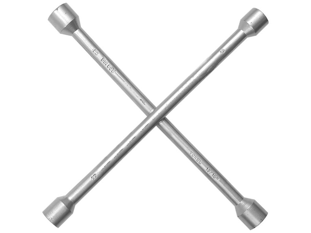 Celokovový klíč ve tvaru kříže, který je určen pro povolování či utahování matic kol automobilů.
