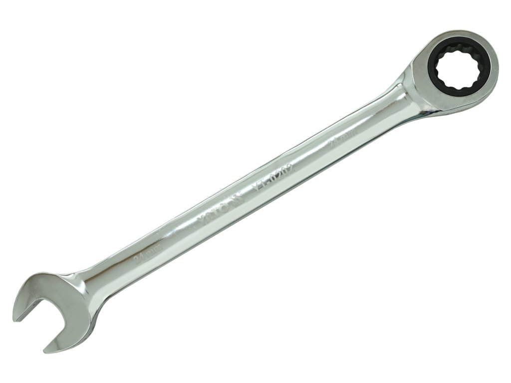 Ráčnový očkoplochý klíč Yato - na jedné straně klasický stranový klíč, na straně druhé očkový klíč s dvanáctihranným profilem vybaveným ráčnou s jemným dělením 72 zubů. Tělo klíče je vyrobeno z chromvanadiové oceli CrV6140. Povrch je vyleštěn do vysokého lesku.