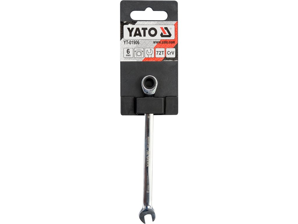 Ráčnový očkoplochý klíč Yato - na jedné straně klasický stranový klíč, na straně druhé očkový klíč s dvanáctihranným profilem vybaveným ráčnou s jemným dělením 72 zubů. Tělo klíče je vyrobeno z chromvanadiové oceli CrV6140. Povrch je vyleštěn do vysokého lesku.