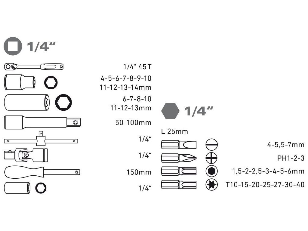 - hlavice nástrčné: 1/4": 4-5-6-7-8-9-10-11-12-13-14mm