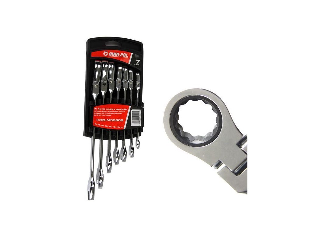 Klíče očkoploché, ráčnové s kloubem 7ks 8-19mm MAR-POL Velmi odolné klíče vyrobené z chrom vanadiové oceli. Klíče jsou umístěny v praktickém plastovém pořadači, díky kterému k nim máme vždy snadný přístup a nikdy se neztratí.Vlastnosti produktu: