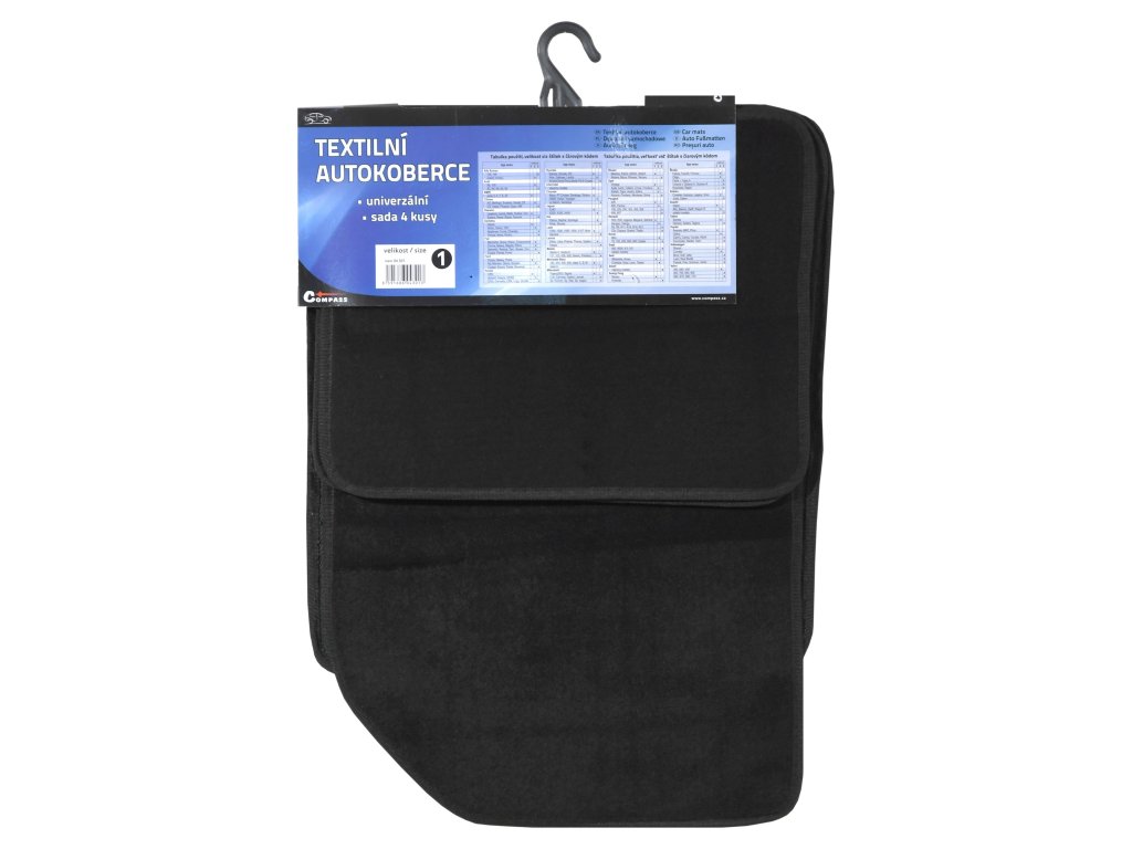 Univerzální textilní koberce do automobilu. Na obalu vyobrazena tabulka základních typů vozidel, na které lze koberce použít. Sada 4 kusy (2x přední, 2x zadní díl).