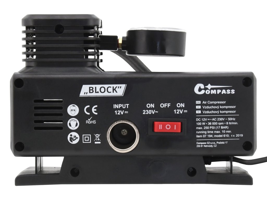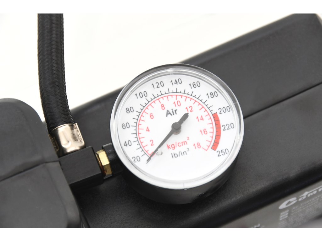 Kompresor je vybavený vestavěným pneuměřičem, který zobrazuje naměřený tlak v několika jednotkách.