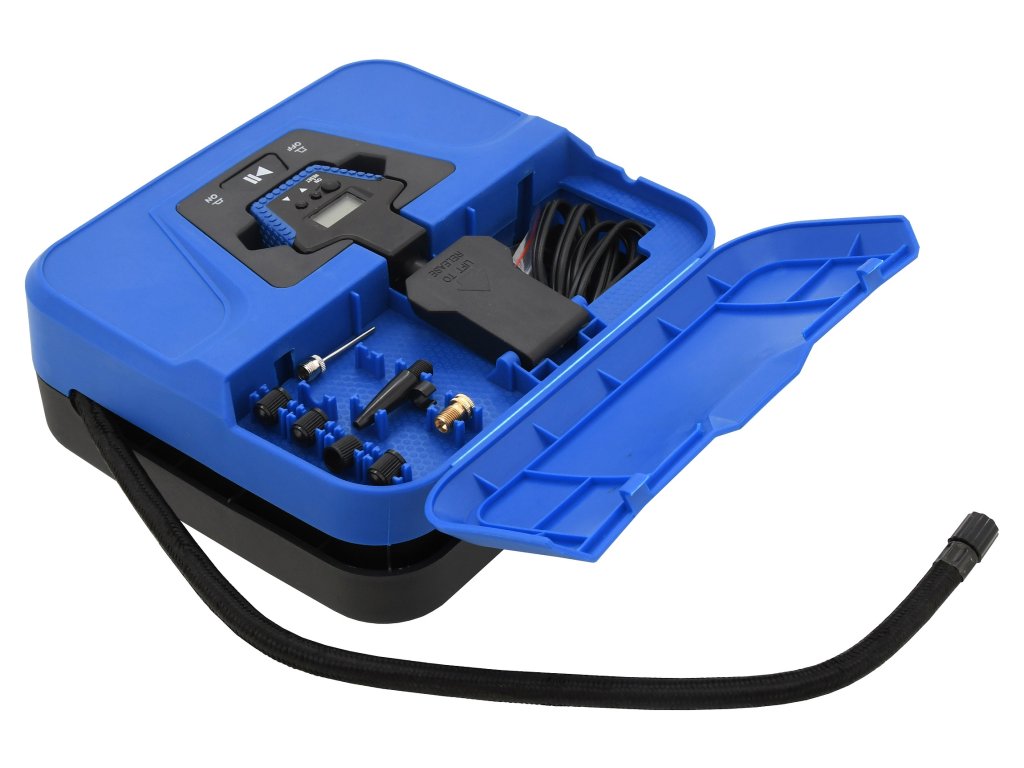 Napájení 12V, dlouhý kabel se zástrčkou do autozapalovače. Adaptéry pro huštění míčů, matrací nebo bazénů, 4x náhradní čepička k ventilku Auto stop - kompresor nahustí pneumatiku na předem nastavený tlak a následně automaticky kompresor vypne.