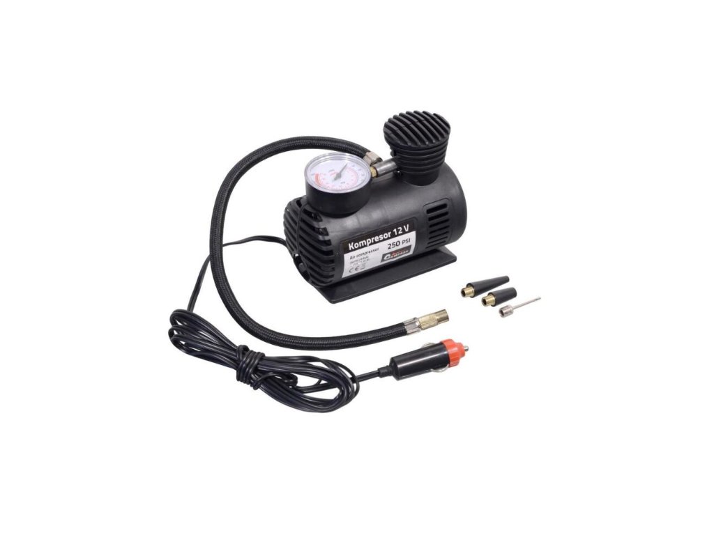 Vzduchový kompresor vybavený měřičem tlaku s celokovovým adaptérem pro klasický autoventilek. Napájení 12V, kabel se zástrčkou do zásuvky automobilového zapalovače. Součástí balení jsou přídavné adaptéry pro huštění gumových matrací, míčů apod.