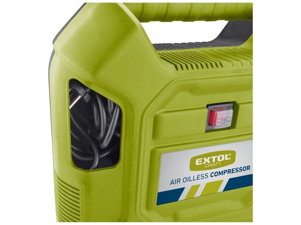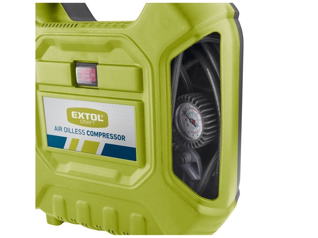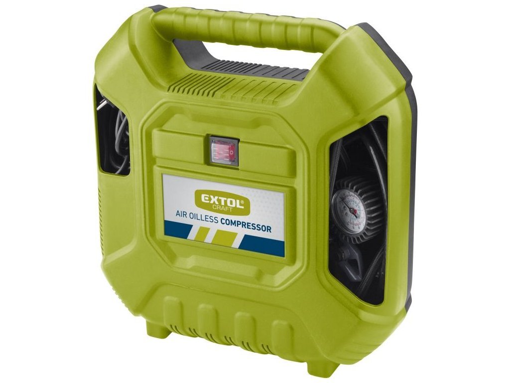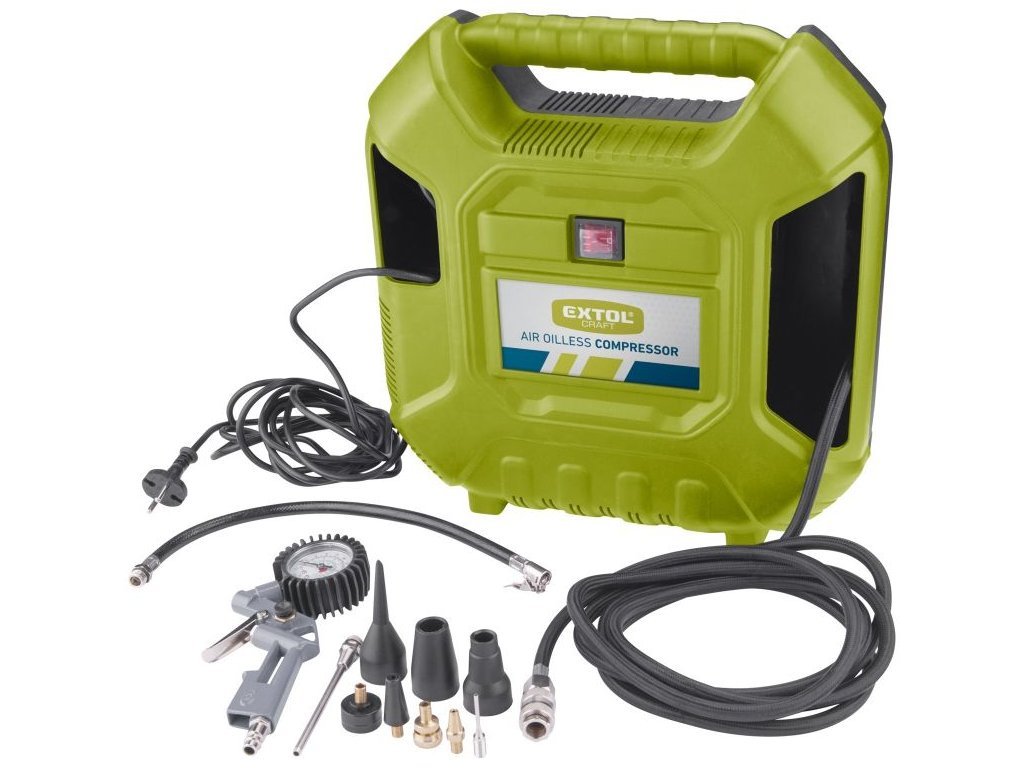 Bezolejový pístový kompresor je určen pro malé práce v domácnosti a domácím prostředí při činnostech, a to zejména k plnění pneumatik automobilů, motocyklů a kol. Díky mnoha různým dodávaným koncovkám určených k připojení na hadici plniče, lze rychle a bez námahy nafouknout objemná nafukovací lehátka, postele, čluny atd., přiloženou jehlou sportovní míče, cvičební balóny apod. Plnič pneumatik je vybaven integrovaným tlakoměrem a upouštěcím ventilem. Lze na něj také našroubovat ofukovací nástavec. Dále jde použít pro drobné práce se stříkacím, čistícím, nýtovacím, hřebíkovacím a sponkovacím nářadím. Hadice je pokryta tkaninou, která zmenšuje možnost zašmodrchání a příjemně se s ní pracuje. Pro velký dosah je kompresor vybaven 5m napájecím kabelem a 3m tlakovou hadicí. Kabel, hadice a veškeré příslušenství lze pohodlně uschovat v těle kompresoru. Na spodní straně kompresoru jsou umístněné gumové přísavky, které tlumí vibrace přenášené do podlahy a stabilizují kompresor na jednom místě.