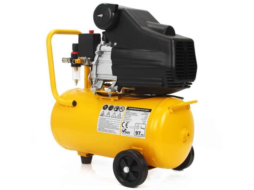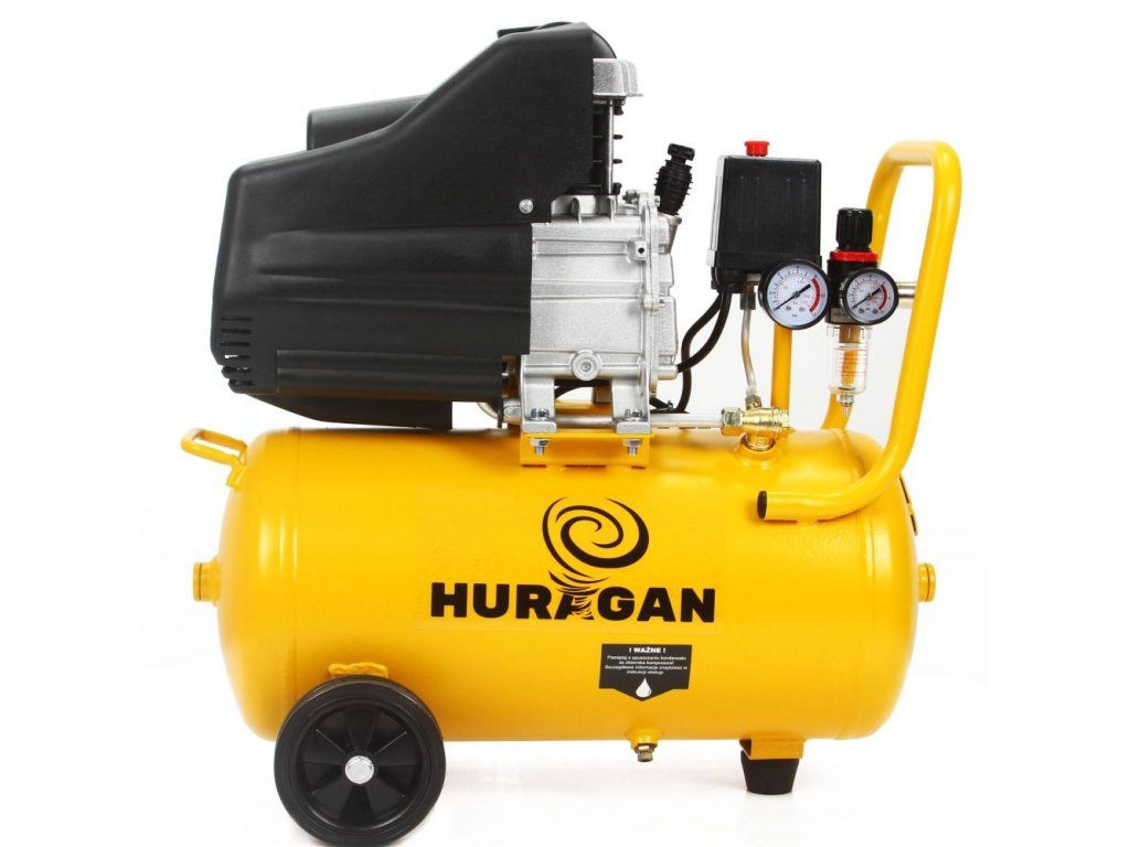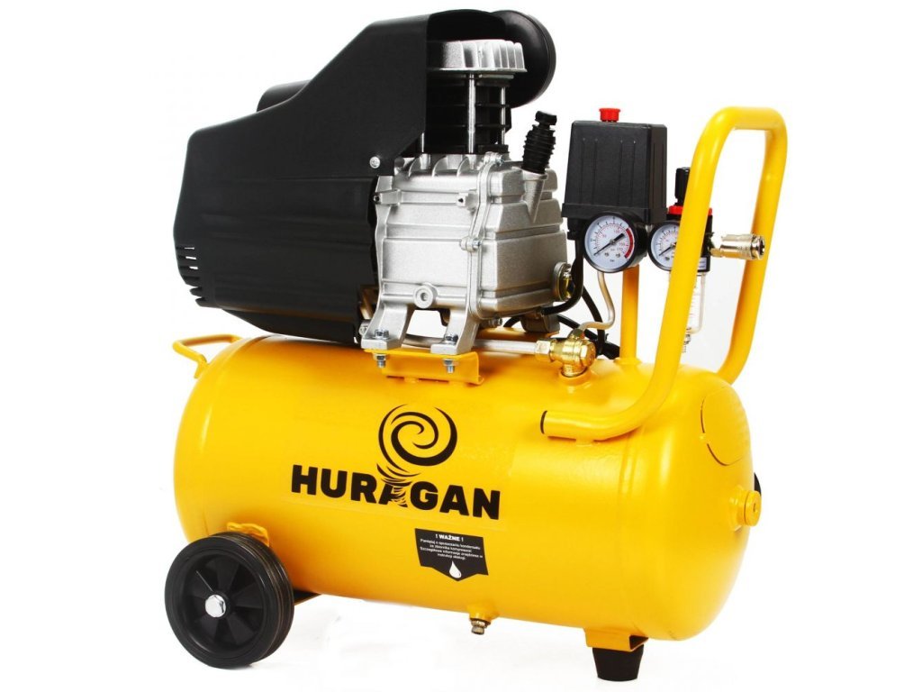 Olejový kompresor Huragan s nádrží 24 l je určený pro malování (menší povrchy), foukání, čerpání, čištění a podobné činnosti. Díky nízké hmotnosti je kompresor velmi ergonomický a mobilní, dále má filtraci vzduchu přes filtr namontovaný na kompresoru, automatický mazací systém, reduktor tlaku a pevná transportní kolečka. Vyznačuje se nízkou spotřebou energie při zachování vysokých provozních parametrů, které lze sledovat pomocí přesných manometrů. Ve spodní části válce je instalován vypouštěcí ventil, který umožňuje odvod kondenzátu.
