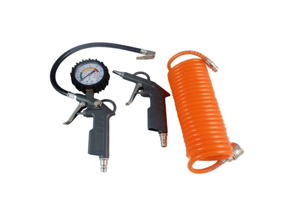 pistole 3 v 1 pro nafukování kol s manometrem v rozsahu [bar / psi] - 0-12 / 0-174, pneumatická pistole, pneumatická hadice o délce [mm] - 5000.<BR/><BR/>1. pistole na pumpování s manometrem:<BR/><BR/> délka hadice 350mm<BR/> koncovka rychloupínací euro 1/4” <BR/> rozsah do 15 bar nebo 220 psi <BR/> gumový obvod budíku <BR/> vybaven vypouštěcím ventilem vzduchu <BR/> hodně dobrá kvalita<BR/><BR/><BR/>2. pistole na vyfukovaní:<BR/><BR/> maximální pracovní tlak 12bar<BR/> celokovové připojení na rychlospojku<BR/><BR/><BR/>3. pistole na stříkání s dolní nádrží:<BR/><BR/> zásobník 1 litr<BR/> univerzální rychloupínák 1/4 palce <BR/> dlouhá tryska rozprašovače <BR/> mosazná koncovka a zámky <BR/> regulace výstupního tlaku<BR/><BR/><BR/>4. pistole na malování s horní nádrží a tryskou 1,4 mm:<BR/><BR/> tryska průměr 1,4 mm<BR/> regulace množství toku laku <BR/> hliníkové těleso <BR/> nádoba 600 ml <BR/> doporučený pracovní tlak 3 - 5 barů <BR/> závit 1 / 4 palce<BR/> upevnění -rychlospojka<BR/><BR/><BR/>5. spirálová hadice 5m s rychlospojkamiDoplňkové parametry