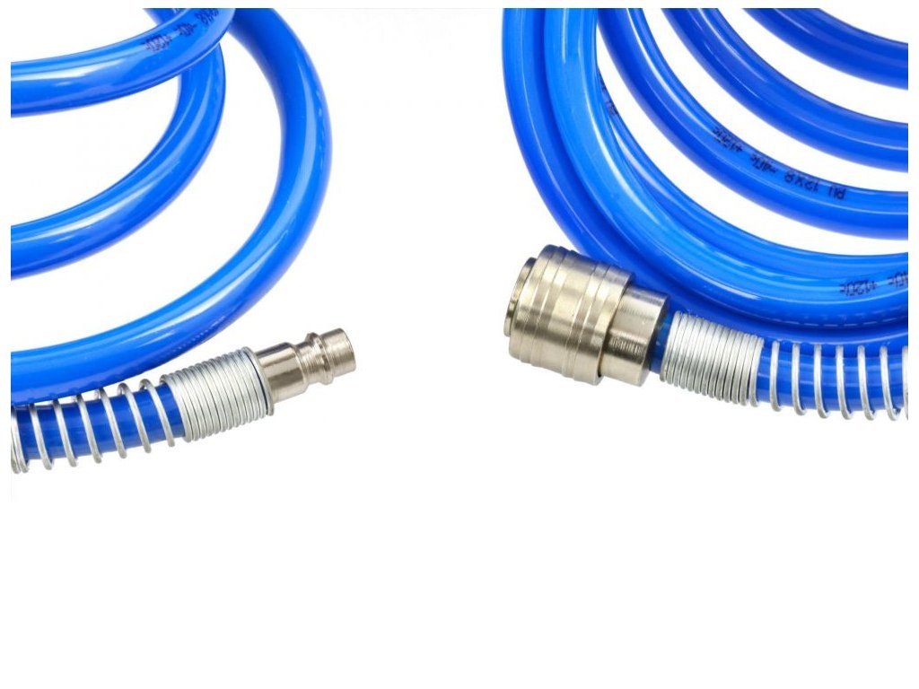 Spirálová pneumatická hadice o délce 20 m. Díky otočné rychlospojce lze k němu připojit jakékoliv pneumatické zařízení.