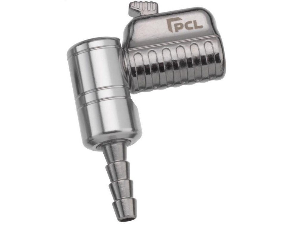 Hustící koncovka na foukání pneumatik průměru 8 mm, otočná, s extra silnou pojistkou – PCL CH4K01Funkce Auto Clip-On: koncovka se po nasazení na ventil sama přichytí, otočením ve směru hodinových ručiček je možné uchycení ještě zesílit. Po nahuštění kola se koncovka snadno odpojí tlačítkem.