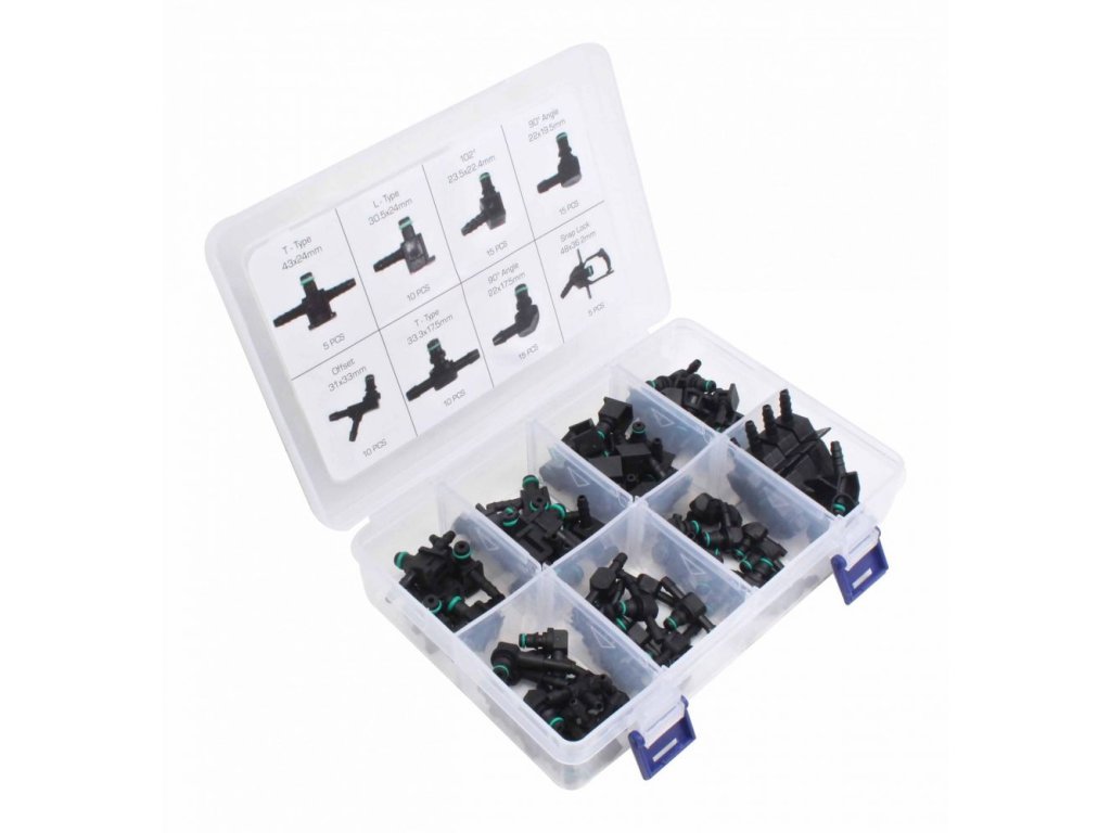 Sada konektorů v různých tvarech a velikostech určená pro připojení zpětného vedení nafty v sadě 85 ks.