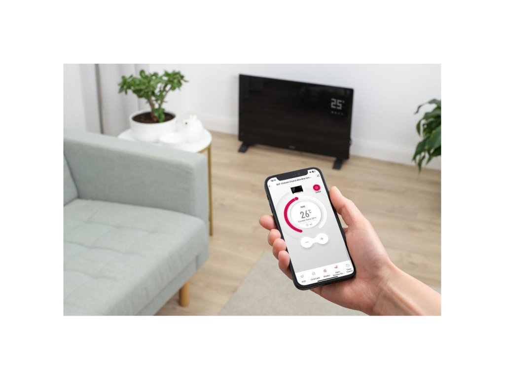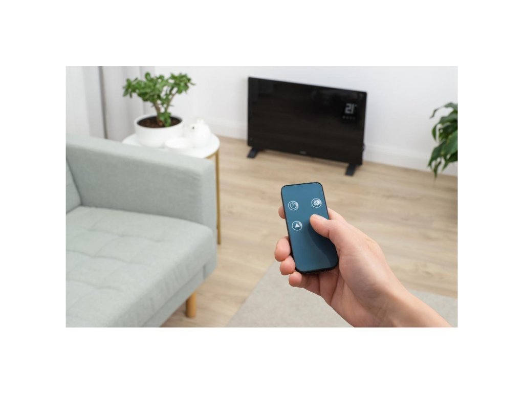 Nastavení teploty je možné třemi způsoby – pomocí dotykového LCD displeje na tělese konvektoru, přiloženým dálkovým ovládáním nebo prostřednictvím mobilní aplikace SENCOR HOME s podporou Wi-Fi a Bluetooth. Aplikace umožňuje kontrolu a řízení topení odkudkoli, sledování aktuální teploty a vytváření týdenních scénářů pro automatické topení podle denního režimu.