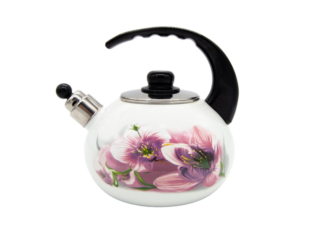 Kvalitní smaltovaná čajová konvice bílé barvy zvenku i uvnitř, s dekorem tulipán.Tvarovaná rukojeť, odnímatelná nálevka a píšťalka.