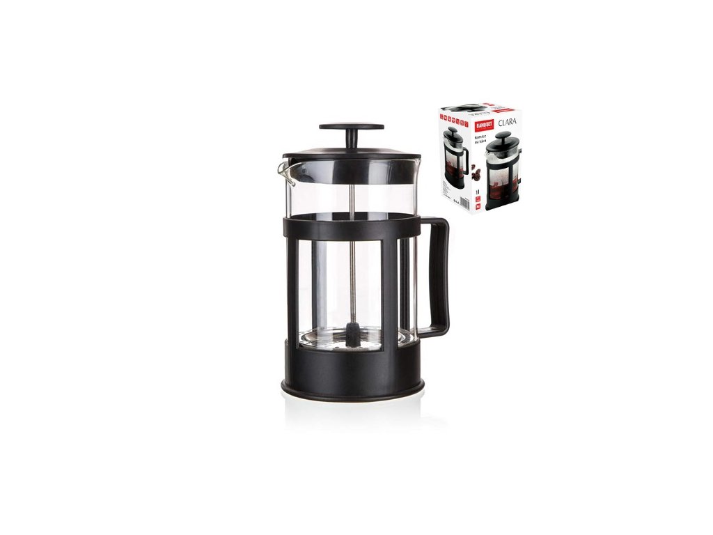 Konvice na kávu CLARA 1L je skleněná konvice s plastovými doplňky v černé barvě a filtračním pístem z nerezové oceli, nerez 18/8, sklo je určeno pro nápoje do teploty 120 st. C (sklo není varné).Není vhodné do myčky nádobí a mikrovlnné trouby.