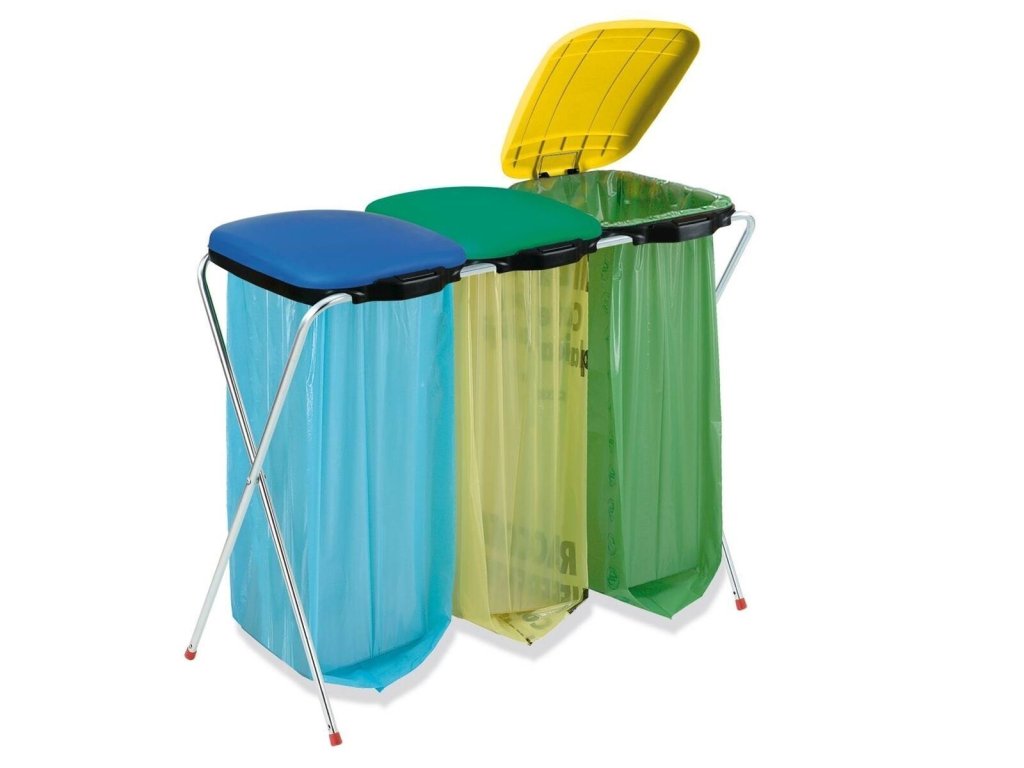 Skládací kovový stojan s plastovým víkem pro uchycení odpadkového pytle.Vhodné pro použití na tříděný nebo smíšený odpad.