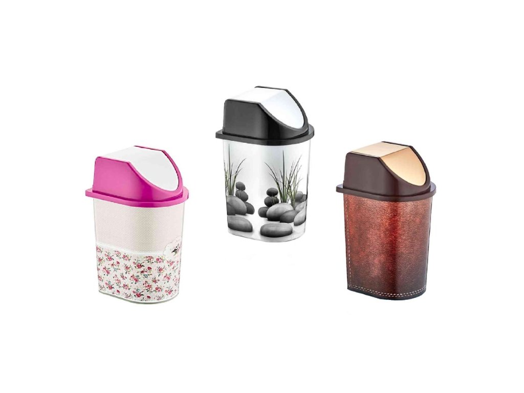 Plastový odpadkový výklopný koš dekorovaný.Objem 5.7 litru, rozměry 18.3 x 20 x 32.5 cm.