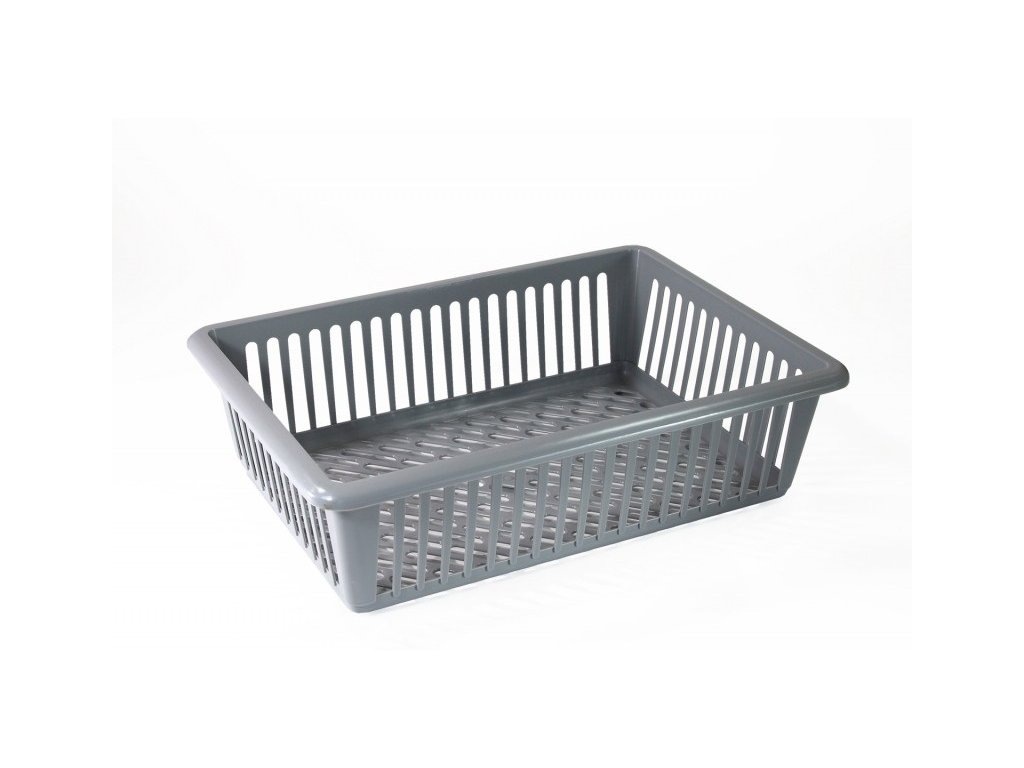 Plastový děrovaný košík, rozměry 40 x 28 x 11 cm.Mix barev dle skladové dostupnosti (bílá, žlutá, zelená, šedá, krémová).