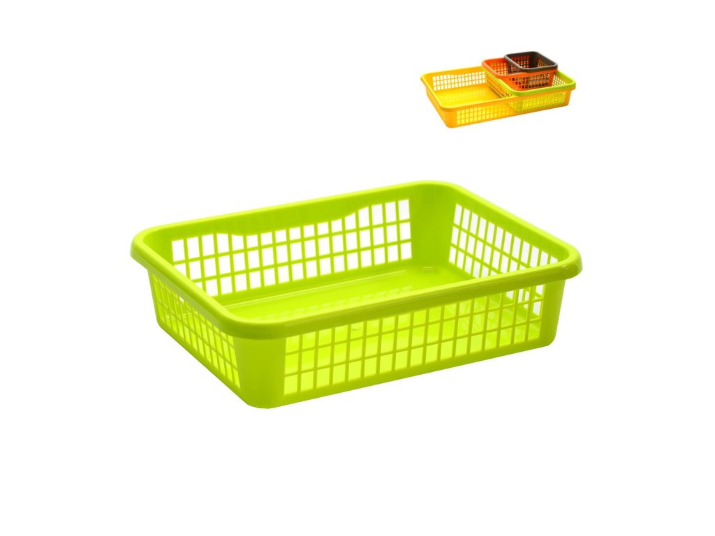 - středně pevný plastový děrovaný košík- rozměry 25,5 x 19,5 x 6,6 cm, odpovída velikosti A5, objem cca 3 litry