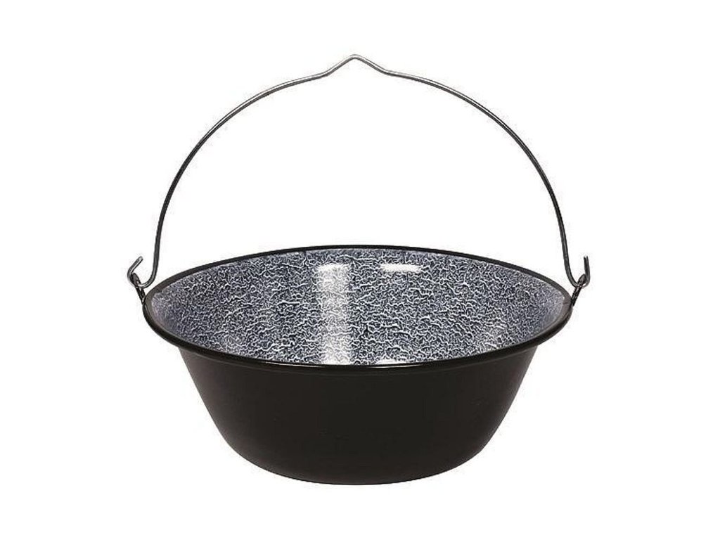 Kovový kotlík smaltovaný na guláš s pozinkovaným kovovým držadlem.