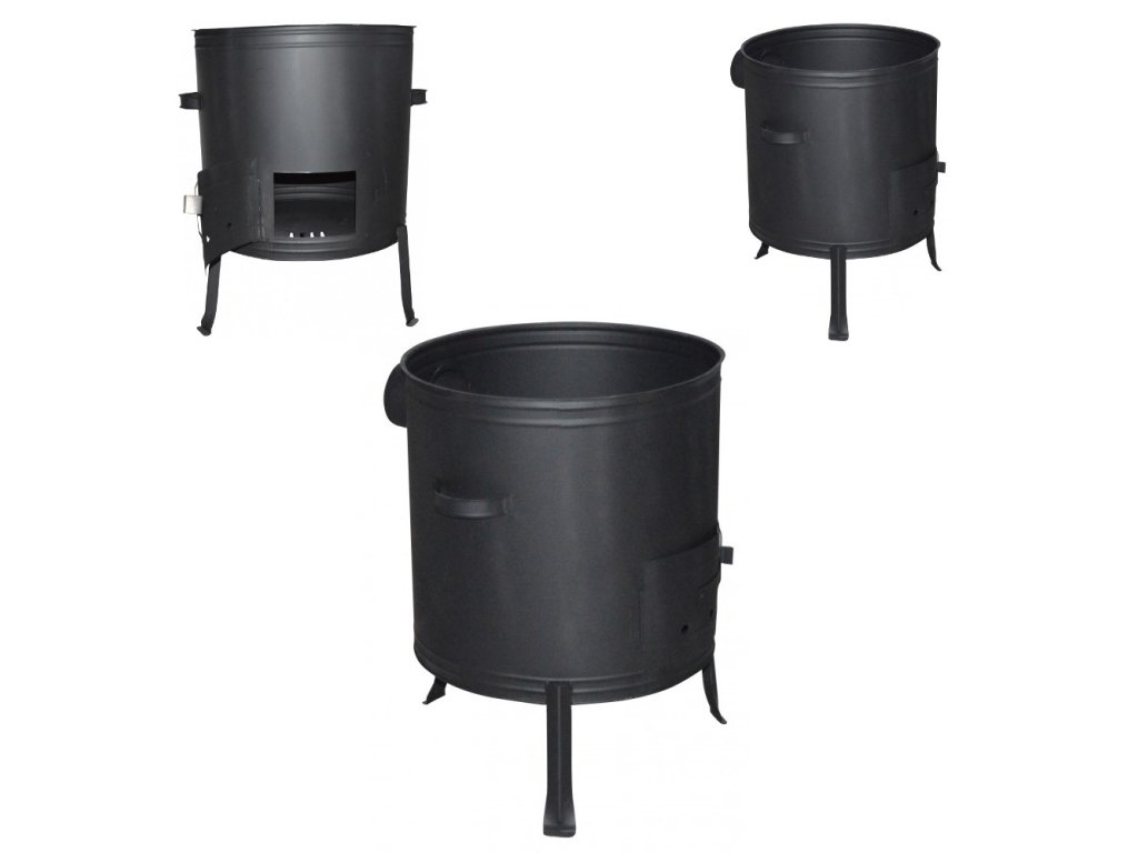 Průměr otvoru pro kotel je cca 50 cm, doporučený objem kotle 50 litrů, výška 67 cm, síla stěny 1 mm, výška od dna po horní okraj 48 cm.