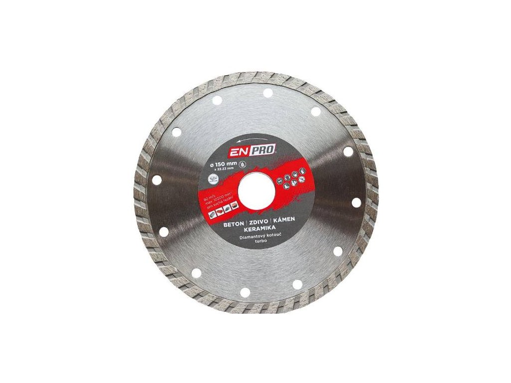 - Diamantové kotouče prémiové značky ENPRO, která je zárukou profesionální kvality. ENPRO kotouče vynikají především vysokou kvalitou použitého materiálu a dlouhodobou životností. Certifikace MPA. Turbo kotouče se využívají na řezání různých druhů materiálů jako jsou: beton, zdivo, kámen, keramiku, žulu, mramor. Turbo kotouče jsou ideálním výběrem pro kombinaci mezi segmentovým a celoobvodovým kotoučem. Poskytují hladký řez a lze je využít na řezání za mokra i sucha.