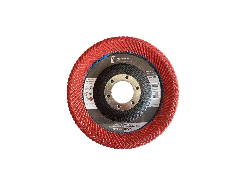 - brusný kotouč se špičkovým samoostřícím keramickým brusivem, kde lamely jsou na všech pracovních plochách (spodní, čelní a horní) kotouče a tvarově jsou přizpůsobeny pro broušení standardně i obtížně dostupných svarových ploch jakýchkoliv svarků jakož i všech typů obrobitelných materiálů, běžné oceli a ocele vyšších pevností, legovaná ocel, nerezovaných ocelí, tvrdých materiálů, svařovacích materiálů atd.