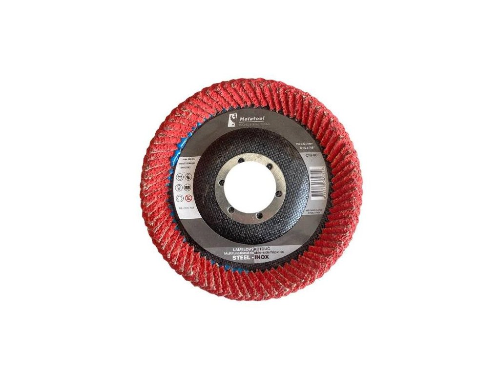 - brusný kotouč se špičkovým samoostřícím keramickým brusivem, kde lamely jsou na všech pracovních plochách (spodní, čelní a horní) kotouče a tvarově jsou přizpůsobeny pro broušení standardně i obtížně dostupných svarových ploch jakýchkoliv svarků jakož i všech typů obrobitelných materiálů, běžné oceli a ocele vyšších pevností, legovaná ocel, nerezovaných ocelí, tvrdých materiálů, svařovacích materiálů atd.