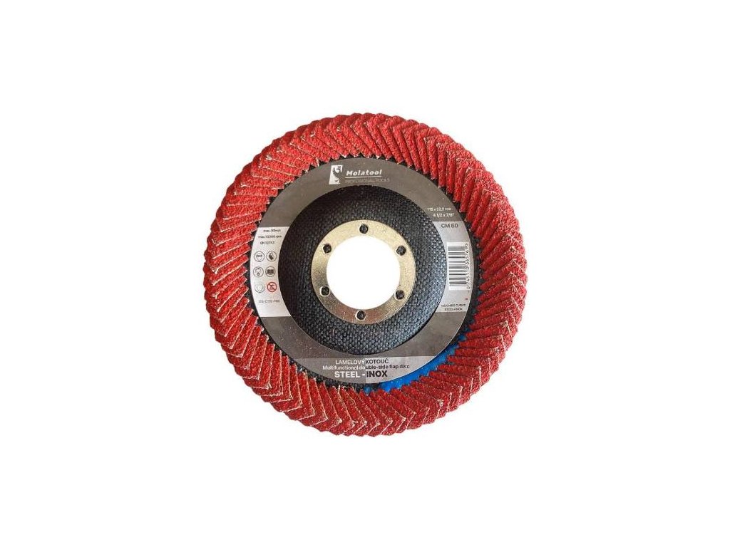 - brusný kotouč se špičkovým samoostřícím keramickým brusivem, kde lamely jsou na všech pracovních plochách (spodní, čelní a horní) kotouče a tvarově jsou přizpůsobeny pro broušení standardně i obtížně dostupných svarových ploch jakýchkoliv svarků jakož i všech typů obrobitelných materiálů, běžné oceli a ocele vyšších pevností, legovaná ocel, nerezovaných ocelí, tvrdých materiálů, svařovacích materiálů atd.