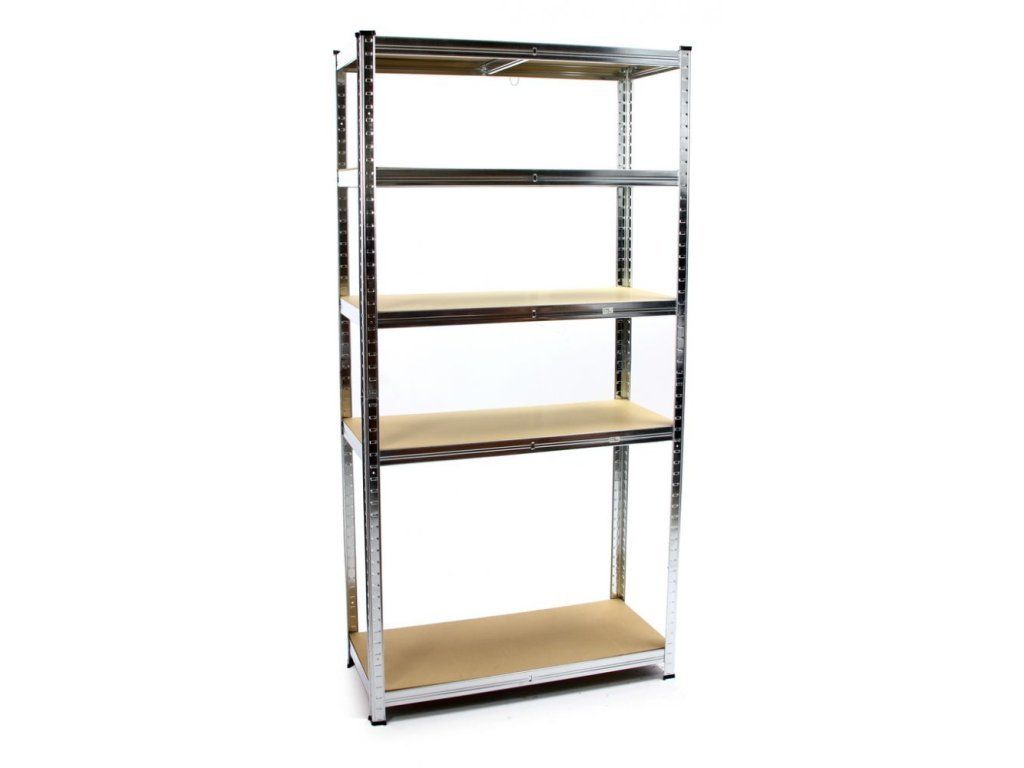 Kovový regál se skládá z pěti polic. Každá police má nosnost až 175 kg. Regál lze rozložit na dva menší regály.