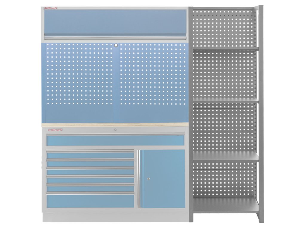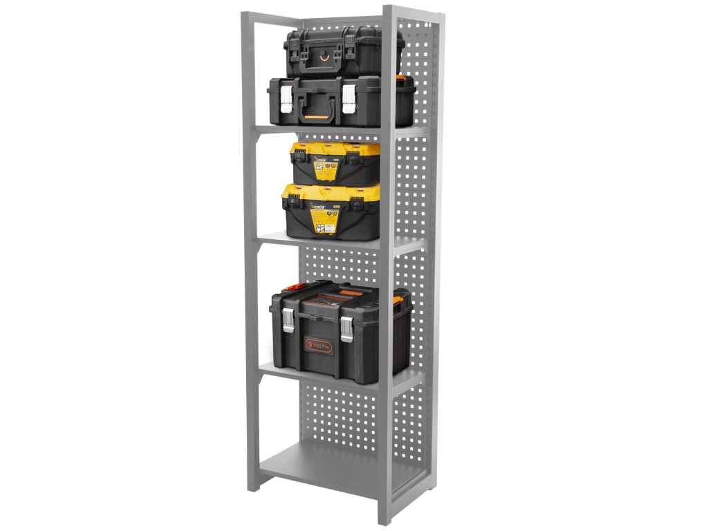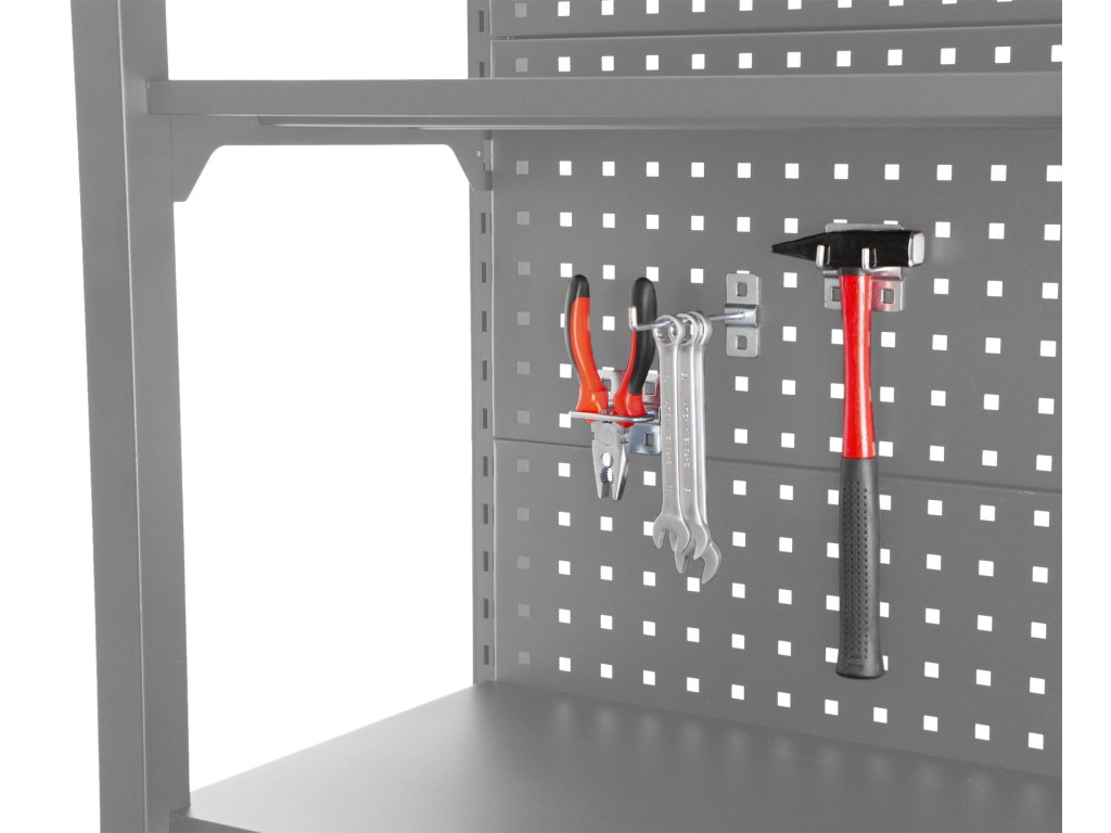 Stabilitu regálu zajišťují dvě bočnice a zadní děrovaná deska, která lze také využít pro zavěšení drobného nářadí pomocí háčků (nářadí a háčky nejsou součástí balení).