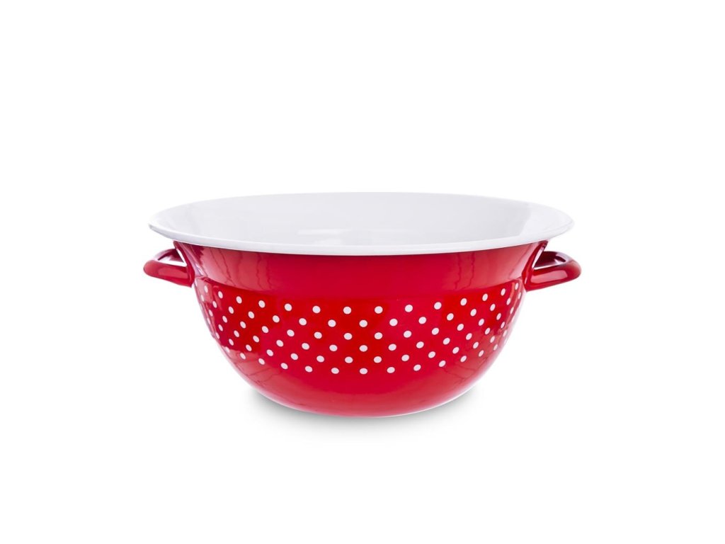 Zadělávací smaltovaná mísa s uchy.Barva červená s bílými puntíky.