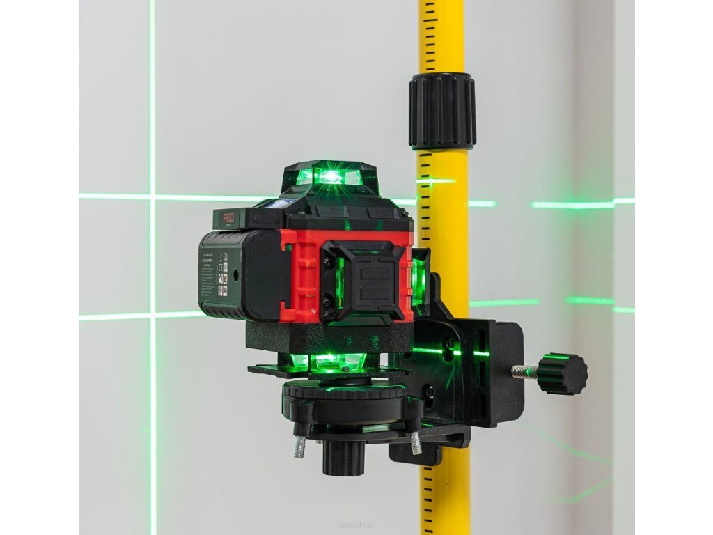 Křížový laser s 360° 4D, se zeleným paprskem, představuje výkonný nástroj pro přesné zaměřování a nivelaci. Laser disponuje konstantním provozním režimem s detektorem laserového paprsku, který zvyšuje dosah laseru, a také manuálním provozním režimem. Se stupněm krytí IP54 proti vodě a prachu je tento laser vhodný pro použití v různých podmínkách. Laser má 1/4" závit pro snadnou montáž na stativ a kyvadlový zámek pro bezpečnou přepravu. Dálkové ovládání umožňuje pohodlné nastavení a manipulaci s laserem. Displej zobrazuje stav nabití baterie. Zelené brýle a terč jsou součástí balení, stejně jako různé druhy úchytů a adaptér závitů pro flexibilní použití.