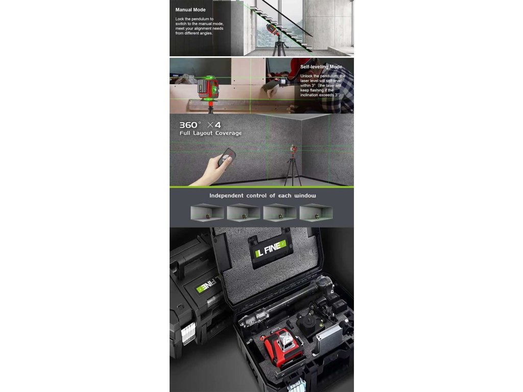Křížový laser L FINE 4D 16 linií s autonivelací a příslušenstvím Praktická laserová vodováha se 4 laserovými hlavami umožňující vykreslení až 16 linek v úhlu 360° ve dvou vodorovných a jedné svislé linií. Všechny linky lze vykreslit současně. Je vybavená bohatým příslušenstvím, umožňujícím využití v různých podmínkách.**Technické údaje:**