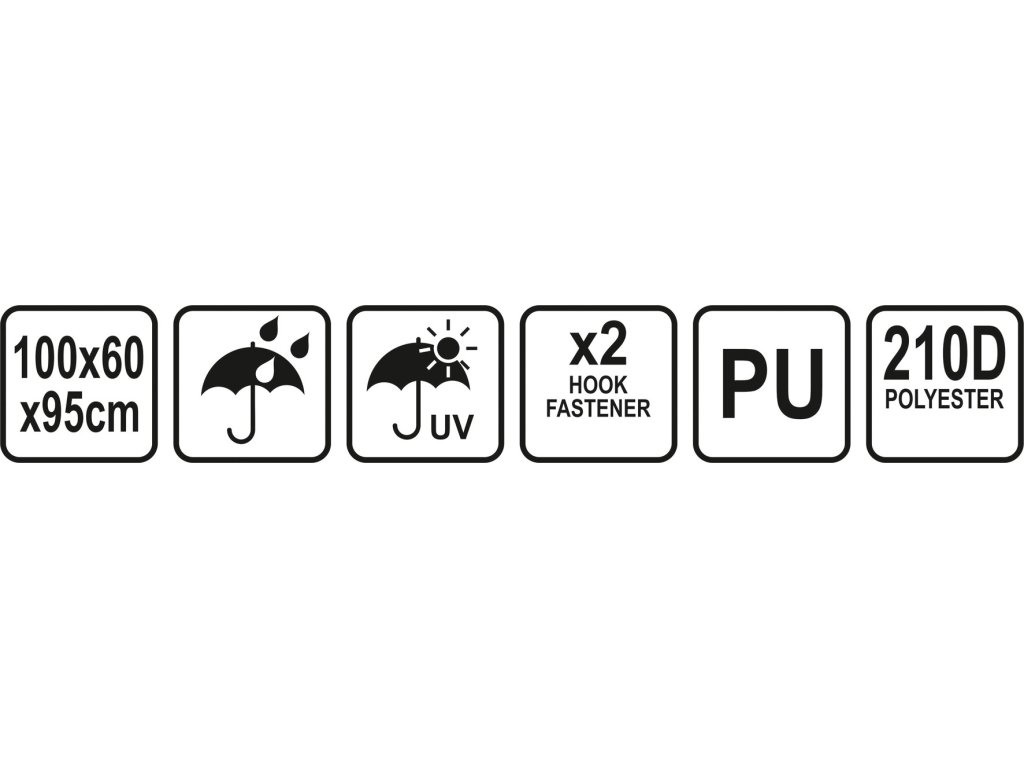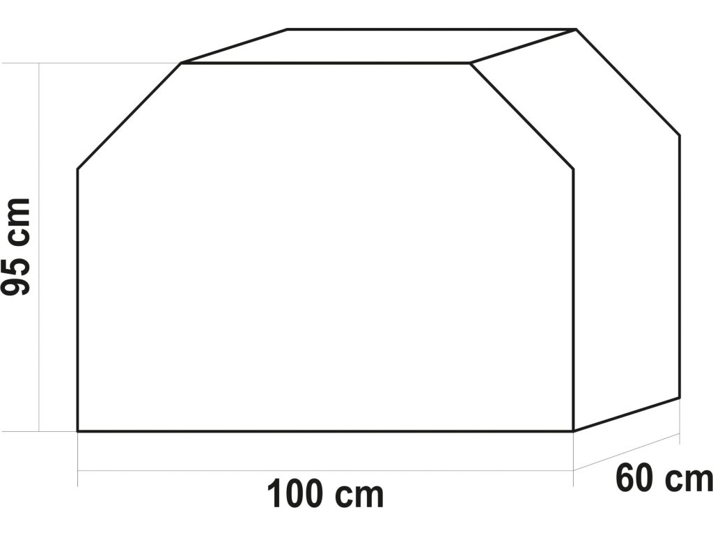 Rozměry krytu 100 x 95 x 60 cm, lichoběžníkového tvaru, vhodné pro grily LUND TO-99512, TO-99586, TO-99588, TO-99519, TO-99514, ale i jiné grily s obdobnými rozměry.