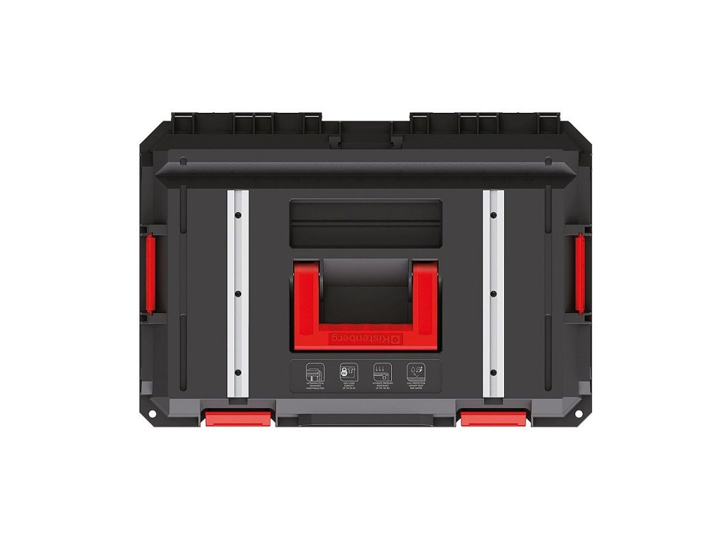 Hliníkové kolejnice, integrované ve víku (umožňují připojit G-svorky), dokážou box proměnit v kompaktní, stabilní dílenský stůl. Zásobníky a vnitřní přihrádky s možností vlastní úpravy vnitřního prostoru.