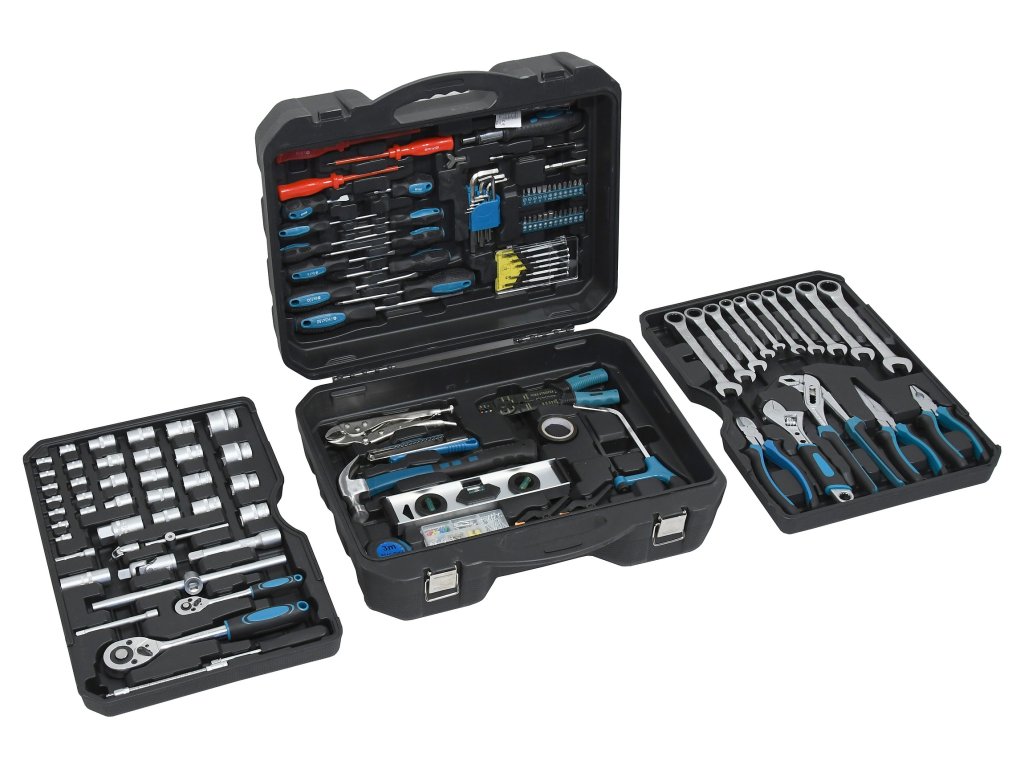 Víko obsahuje izolované, klasické a hodinářské šroubováky, spolu s imbusovými klíči, bity atd. Dále pak vysoce kvalitní ráčny, nástavce, ohebný nástavec, t-vratidla a rúzné prodlužovací nástavce z Chrom-Vanadiové oceli, umístěné ve vloženém platu.
